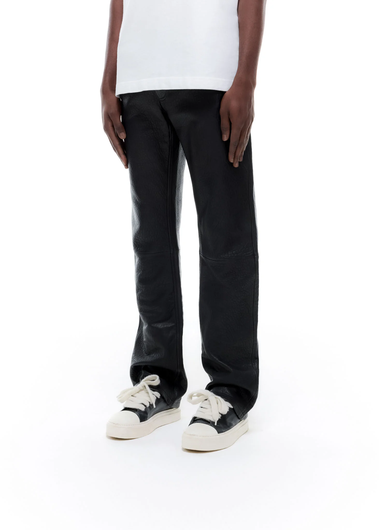 The shrunken lamb jeans, cut from a super soft shrunken Italian lambskin in a straight legged silhouette with a slight flared hemline to stack perfectly on any shoe. Finished with Riri hardware and a leather brand patch.